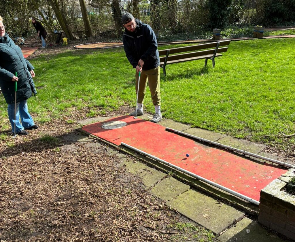 Na het bewonderen van elkaars kunstwerken trokken we door naar het Zuiderpark voor de volgende activiteit. In trainingspakken, gewapend met een golfclub en een balletje, namen we het in groepjes tegen elkaar op tijdens een fanatiek potje minigolf op maar liefst 18 banen. Kun jij raden welk team er met de winst vandoor ging?